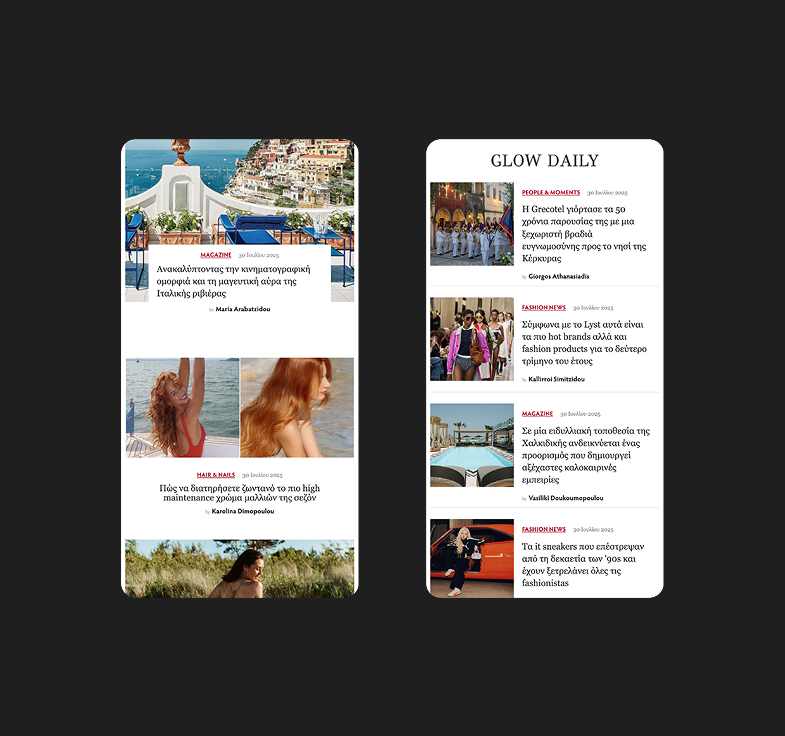 Ο σχεδιασμός του glow.gr έγινε εξολοκλήρου μέσω Sketch, με στόχο την πλήρη ταύτιση με την αισθητική του brand. Δημιουργήσαμε ένα custom UI με 10 διαφορετικά templates άρθρων, που καλύπτουν ποικιλία περιεχομένου όπως παρουσιάσεις προϊόντων, αρχιτεκτονική και μόδα, ενισχύοντας την οπτική ποικιλία και λειτουργικότητα του site. Η ανάπτυξη υλοποιήθηκε σε Laravel (τελευταία έκδοση), με Lightspeed cache και CDN για ταχύτατη φόρτωση και άριστη απόδοση.